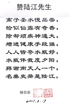 人類幾千年來患以上病癥需終生服藥,幾十年也不能治愈。可是我國南寧的高級(jí)工程師陸 江,于1990年想根治高血壓,研究發(fā)明了離子水瓶,處理出微小分子團(tuán)水供飲用,經(jīng)過醫(yī)院臨床試用和專家鑒定,1999年獲中國發(fā)明專利權(quán),產(chǎn)品于2000年投放市場后一直跟蹤調(diào)查,據(jù)全國各地用戶反饋:祛除了高低血壓、糖尿病和冠心病,并使前列腺增生、咽喉炎、鼻竇炎、慢性氣管炎、支氣管炎、矽肺病、哮喘、慢性胃炎、腸炎、慢性膽囊炎、慢性腎炎、腎衰、膀胱炎、便秘、痔瘡、風(fēng)濕性關(guān)節(jié)炎和濕疹皮炎及中風(fēng)后遺癥等病癥不藥而愈。為什么喝微小水能治20多種病?陸 江從1991年德國科學(xué)家發(fā)現(xiàn)細(xì)胞膜水通道僅為2納米獲得啟發(fā),認(rèn)為多種器官患病是因細(xì)胞脫水,不能正常代謝和分裂增殖,才使器官細(xì)胞減少致衰弱萎縮而形成細(xì)胞缺水性病癥。22年來的實(shí)踐有力地支持了“細(xì)胞脫水致病”這一重要論點(diǎn),表明喝微小水可滿足細(xì)胞的生理需求,補(bǔ)水就能祛病,是生命科學(xué)新亮點(diǎn)。