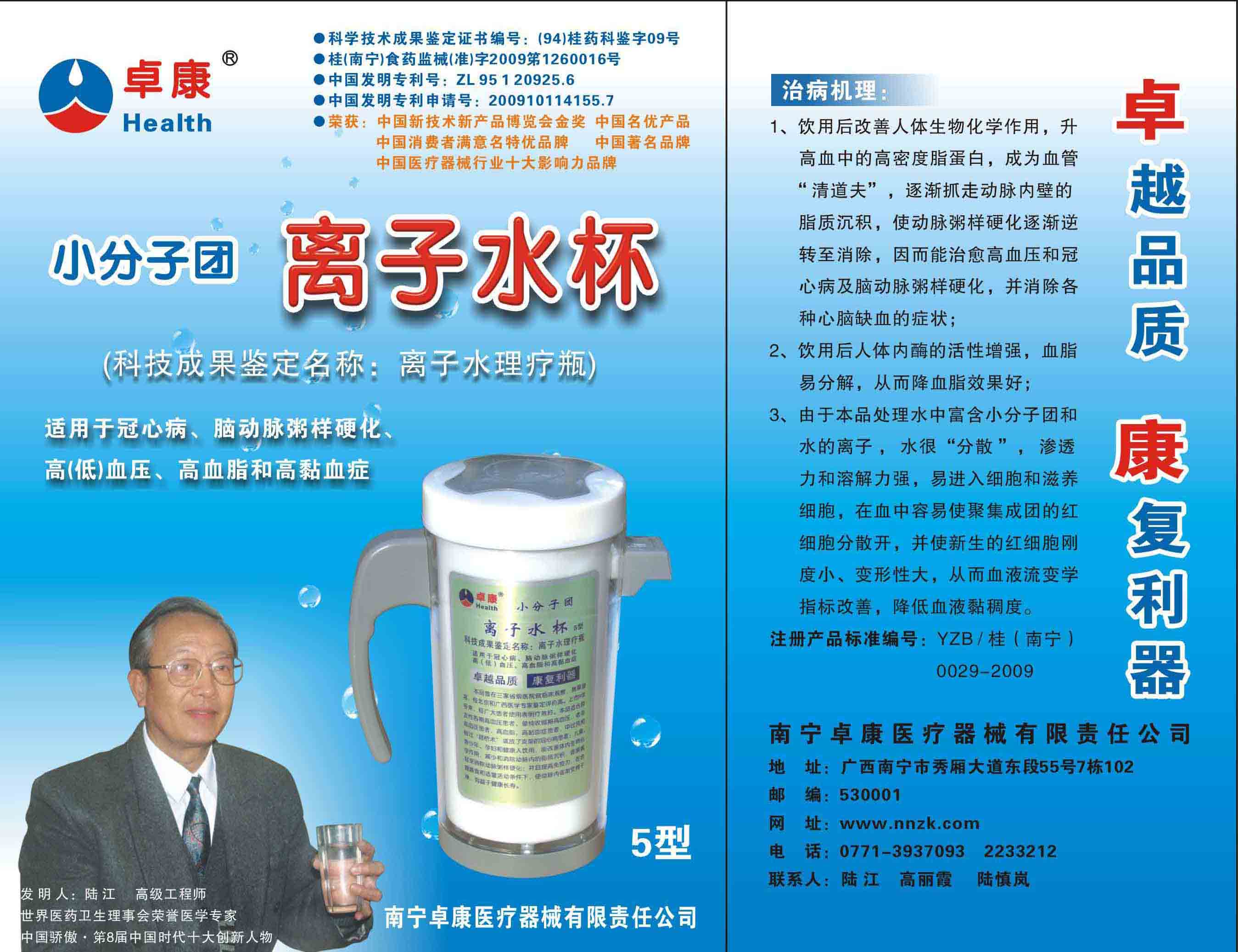- -----南寧卓康微小水科技有限公司原為南寧卓康醫(yī)療器械有限責(zé)任公司 ,用戶普遍反饋高血壓患者飲用2—5個(gè)月,癥狀消除,不再服藥,治愈了高血壓; 冠心病患者,包括已做和未做支架或搭撟手術(shù)者,經(jīng)3—5個(gè)月飲用,消除心痛、胸悶、早搏、房顫和心絞痛等癥狀,逆轉(zhuǎn)至消除動(dòng)脈粥樣硬化和斑塊,一年左右治愈冠心病,心腦電圖正常,經(jīng)冠脈造影掃描無明顯狹窄,表明冠心病痊愈;糖尿病人飲用3-10個(gè)月,血糖尿糖正常,治愈2型糖尿病; 并且使前列腺增生、低血壓、腦萎慢性咽喉炎、慢性氣管炎、支氣管炎、哮喘、矽肺病、甲亢、慢性胃腸炎、膽囊炎、慢性腎炎、腎衰、風(fēng)濕性關(guān)節(jié)炎、痔瘡和濕疹皮炎及中風(fēng)癱瘓或偏癱失語后遺癥等不藥而愈,且多病同治,無需終生服藥,彌補(bǔ)了幾千年來藥物的欠缺,使“微小水”成為人類消除高血壓、冠心病和糖尿病的寶貴資源。腦動(dòng)脈粥樣硬化、低血壓和前列腺增生患者,一般飲用四個(gè)月痊愈;中風(fēng)后遺癥患者,一般飲用8個(gè)月痊愈。請(qǐng)?jiān)旈啞队脩舴答仭窓谀恐写罅炕颊叩姆答佇拧z測(cè)報(bào)告,有的還附照片。產(chǎn)品屢獲大獎(jiǎng),論文也屢獲一等獎(jiǎng)。廣大用戶好評(píng)不斷,有口皆碑。